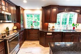 Materials include Danken's custom cabinetry, which were made in cherry wood with a Bordeaux stained finish. The cabinetry includes many made to order options, including; 38" high countertop height, (2) retractable door appliance garages, pull-out paper towel holder, and key/message center. The countertops are Antique Black granite. Flooring is Ceramica Sant'Agostino Pearl porcelain tile in 12x12 and 18x18 tile, installed in a hopscotch pattern. New stainless steel appliances were used throughout, with a 2nd wall oven installed in the island. Final touched included a hand made barn door, separating the kitchen area from the laundry room.